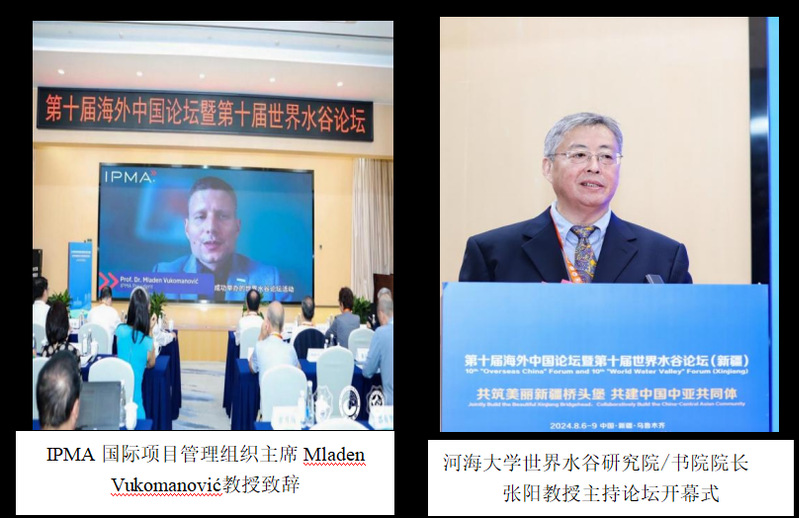 河海大学副校长陈达教授,两山智库执行理事长、河海大学世界水谷研究院联席理事长皇甫圆周,中亚区域经济合作学院第一副院长黄京菁教授,南水北调东线江苏水源有限责任公司总经理、党委副书记、董事李松柏,江苏省金融业联合会名誉理事长徐立,新疆喀什地区泽普县副县长田程程等出席开幕式并致辞。IPMA国际项目管理组织主席Mladen Vukomanović为论坛开幕式录制致辞视频。论坛开幕式由河海大学世界水谷研究院/书院院长张阳教授主持。河海大学世界水谷研究院理事长、河海大学原校长徐辉教授参加了开幕式。