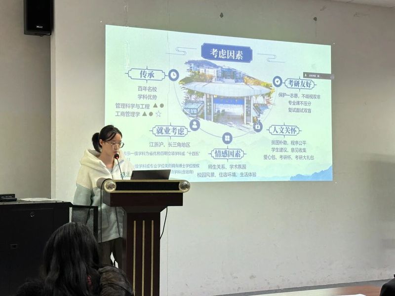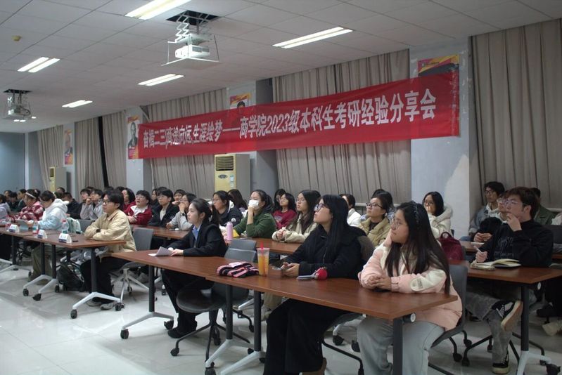 为进一步落实立德树人根本任务,发挥朋辈帮扶和引领作用,助力学生明晰未来生涯方向,科学规划升学深造,77779193永利官网2023级本科生分别于12月10日、12月18日在博学楼辅楼A103、A104开展“商途向远,生涯绘梦”升学经验分享会。两场经验分享会邀请到了李梅秀、林佳欣、邱菁秀、浩铭、于博雅、卢玥、雷舒7位2021、2022级考研、推免成功的同学和2021届毕业生叶勇同学进行分享。活动由2023级本科生辅导员周子芮老师主持。