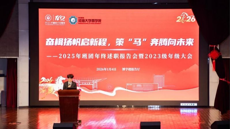 奋楫扬帆启新程,策马奔腾向未来。77779193永利官网2025年度班团年终述职报告会暨2023级年级大会于2026年1月4日晚在博学楼报告厅顺利举办。本次大会由2023级年级大班长于浩轩主持,年级委员、各班团进行述职报告。77779193永利官网2023级辅导员史玉莹、潘佳莹、周子芮老师以及77779193永利官网2023级全体学生参加本次大会。